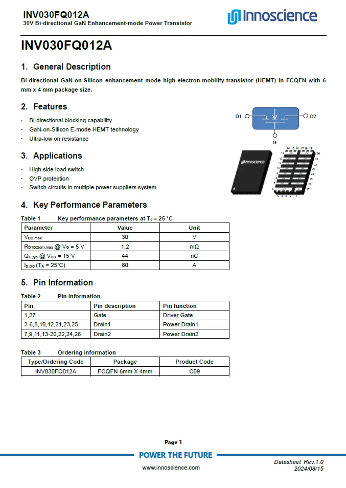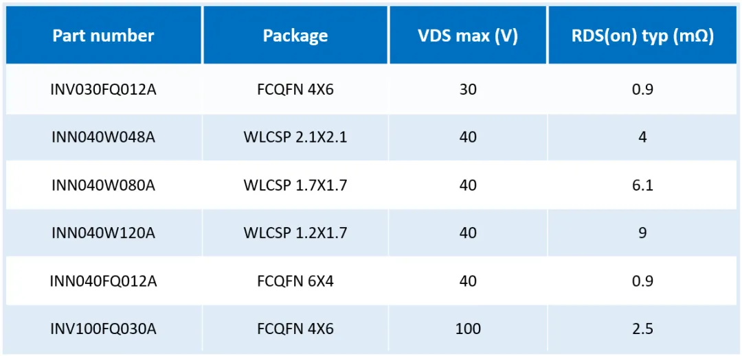 同时,INV030FQ012A 的封装与之前推出的 40V VGaN INN040FQ012A Pin to Pin,可直接替换,给客户更多的电压选择,更灵活地调整系统 BOM。