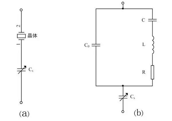 通常石英晶体产品给出的标称频率是外接一个小电容Cs(在石英晶体产品的技术手册中常称为负载电容)时校正的振荡频率,Cs与石英晶体串接如图1所示。利用Cs可使石英晶体的谐振频率在一个小范围内调整。