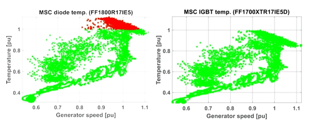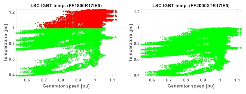 关于FF2000XTR17IE5和FF1700XTR17IE5D的性能优势,我们目前仅从单一稳定工作点进行了考量。实际上,如文献[4]所述,考虑了由风速和电网需求共同决定的现场工作点,由此得出了针对不同发电机转速下LSC和MSC的一系列变流器电流组合。这些不同的工作条件导致不同的结温 Tvj,max。图5和图6显示了两个专用模块如何大大扩展了运行范围。由于LSC IGBT的最大温度相比标准模块减少了25%,MSC二极管的温度下降了13%,从而实现了改进。
